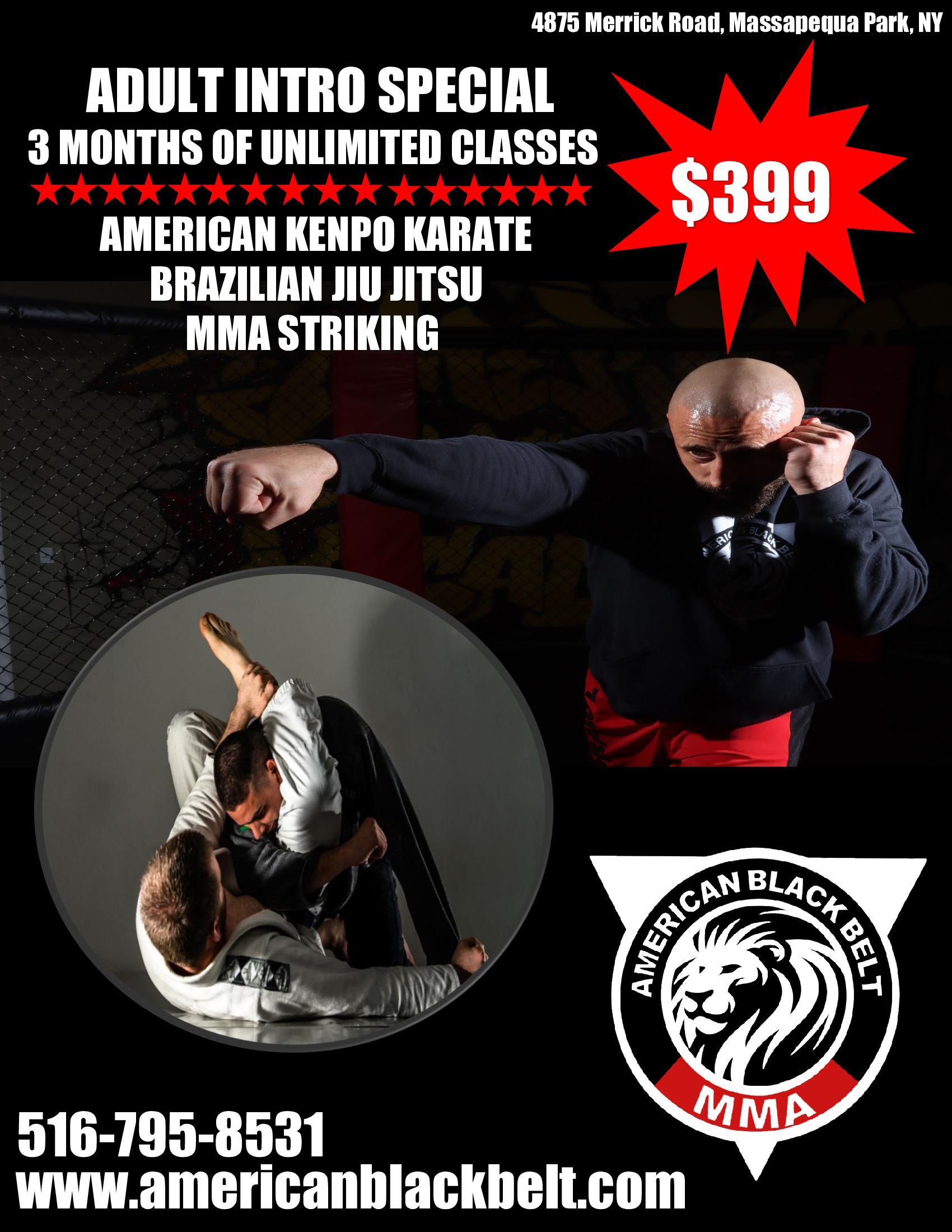 The American Black Belt Academy in Massapequa Park, NY is one of the top Mixed Martial Arts schools in the country. We specialize in the most effective Self Defense strategies through the teaching of American Kenpo Karate, Brazilian Jiu Jitsu and Kickboxing. In addition to self-defense training, our Lights Out Boxing fitness program is guaranteed to get you into the best shape of your life. Plus we offer an After School Program and Summer Camp. We truly offer something for everyone! Programs are available for children as young as 3 1/2 years old!
