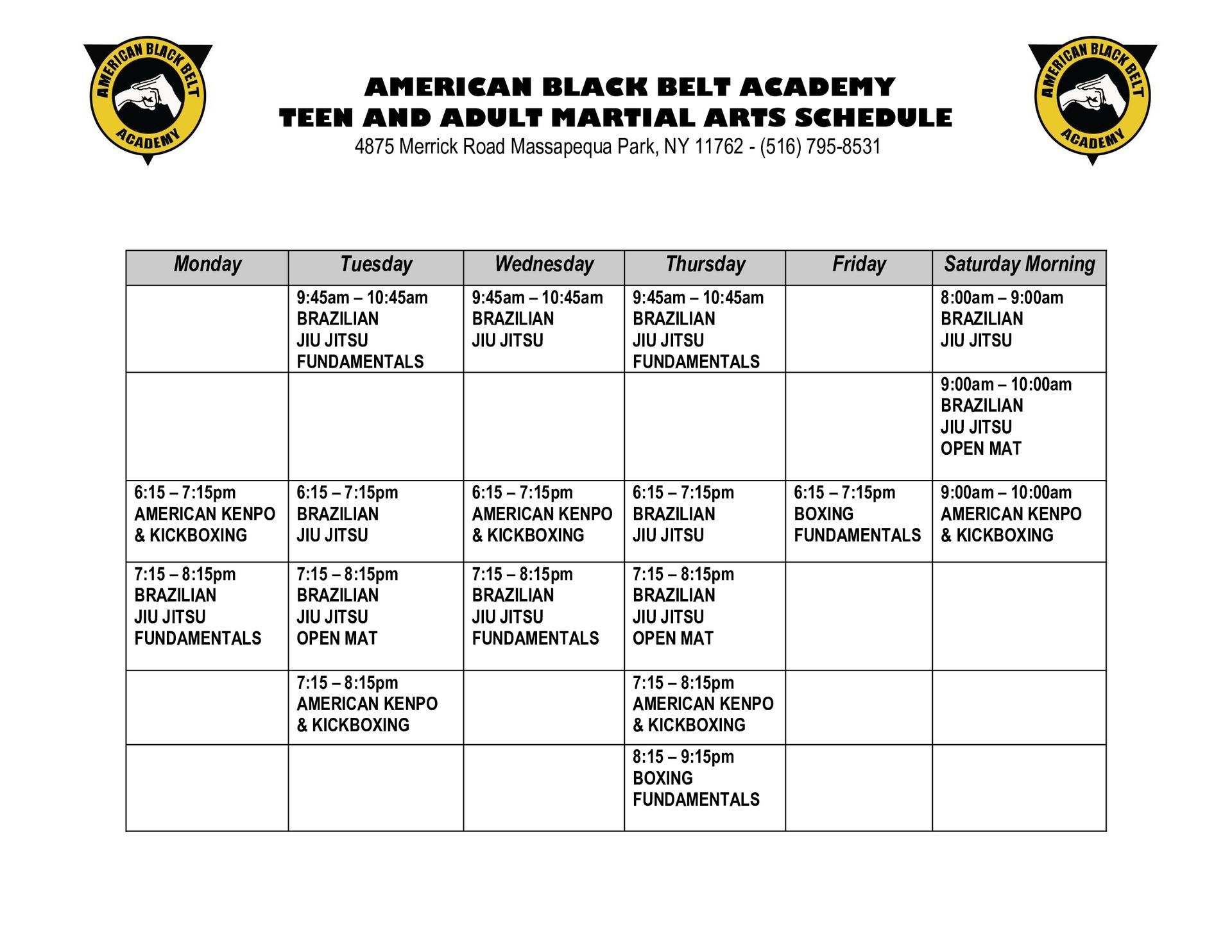 Over the years, we have truly developed an adult Martial Arts program designed for everyone. No matter your age, sex or physical fitness level. The adult Martial Arts program at American Black Belt Academy in Massapequa Park offers a combination of self-defense training and physical fitness while developing self-discipline, perseverance and respect. Our program includes classes in American Kenpo Karate & Kickboxing and Brazilian Jiu Jitsu. Every class is a great cardiovascular workout. All aspects of Ed Parker's Kenpo Karate system are taught, including striking techniques, forms, self-defense techniques, sets and basics. Our curriculum is approved by the Worldwide Kenpo Karate Association. Our Kenpo classes cover American Kenpo' Self Defense strategies as well as Kickboxing, making our students some of the most well rounded striking Martial Artists around. To compliment the striking taught in our American Kenpo class we also teach our students one of the most unstoppable grappling Martial Arts, Brazilian Jiu Jitsu. Brazilian Jiu-Jitsu is a martial art, combat sport and self-defense system that can be trained for sport or self-defense. The focus of Jiu-Jitsu is submission grappling (ground fighting). It teaches a person to successfully defend against an opponent using leverage and technique. The fundamental ground moves are those that neutralize, immobilize, choke or apply pressure or twisting to the body’s larger joints (submissions) to conquer over an adversary’s attack. At American Black Belt Academy in Massapequa Park, we offer a well-balanced adult Martial Arts program for those looking to get into great shape and learn how to defend themselves with the most street applicable Martial Arts around.